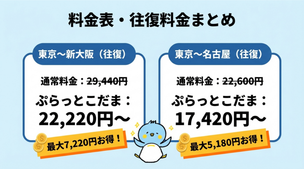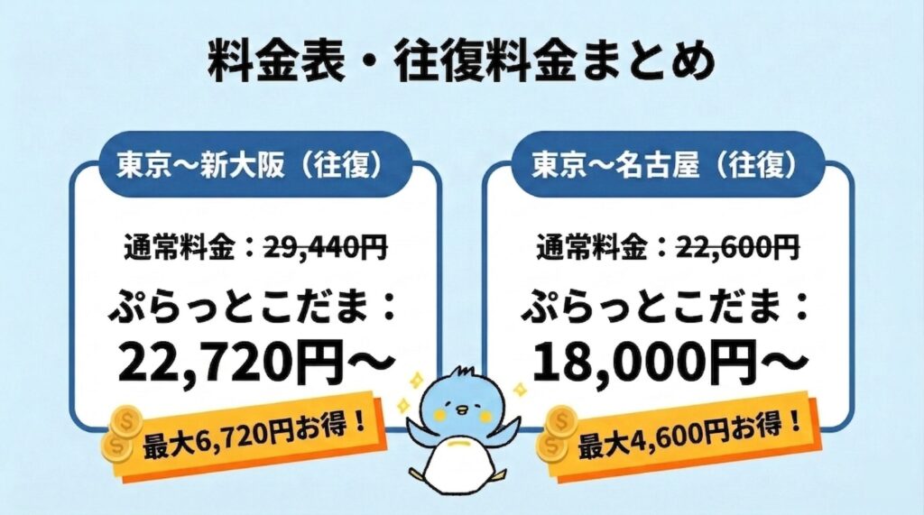 ぷらっとこだまの料金表・往復料金まとめ【主要区間の料金早見表】
