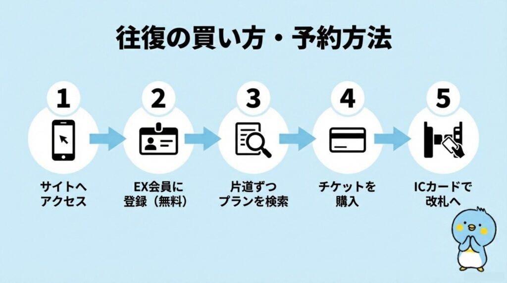 チケットは片道ずつの購入となるので往路・復路それぞれを予約する必要があります。