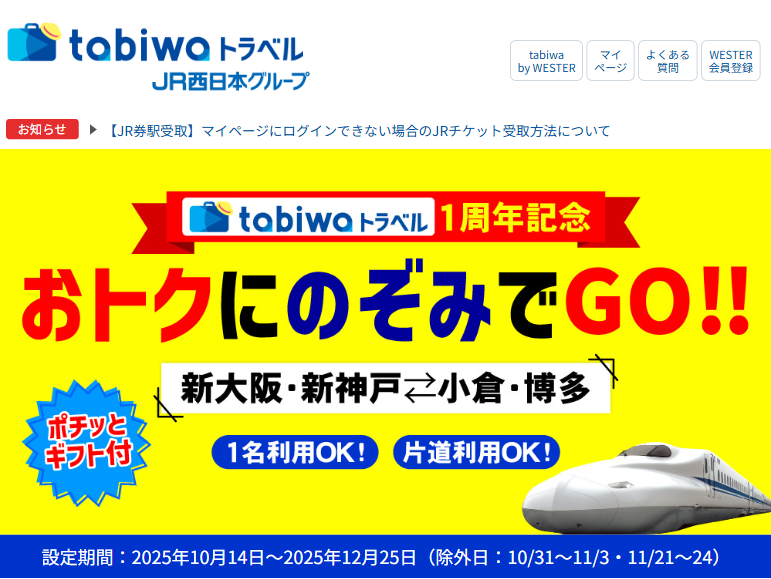 「tobiwaトラベル」で、のぞみ指定席が片道8,000円で利用できる期間限定キャンペーンが登場しました。