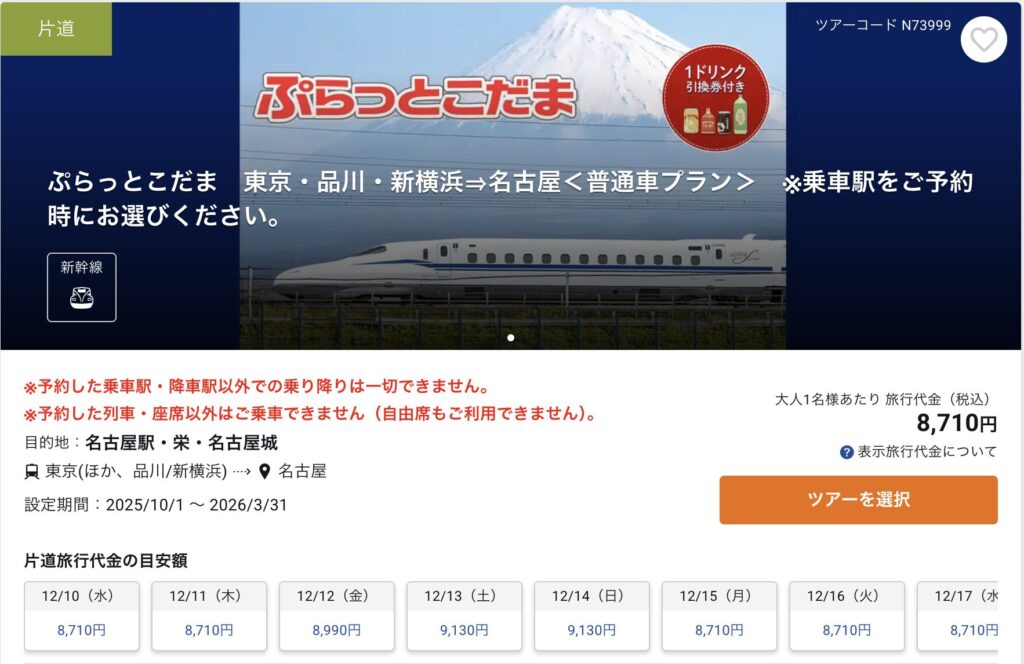 東京-名古屋の新幹線を格安で利用したい人におすすめなのが、JR東海ツアーズ「ぷらっとこだま」プランです。