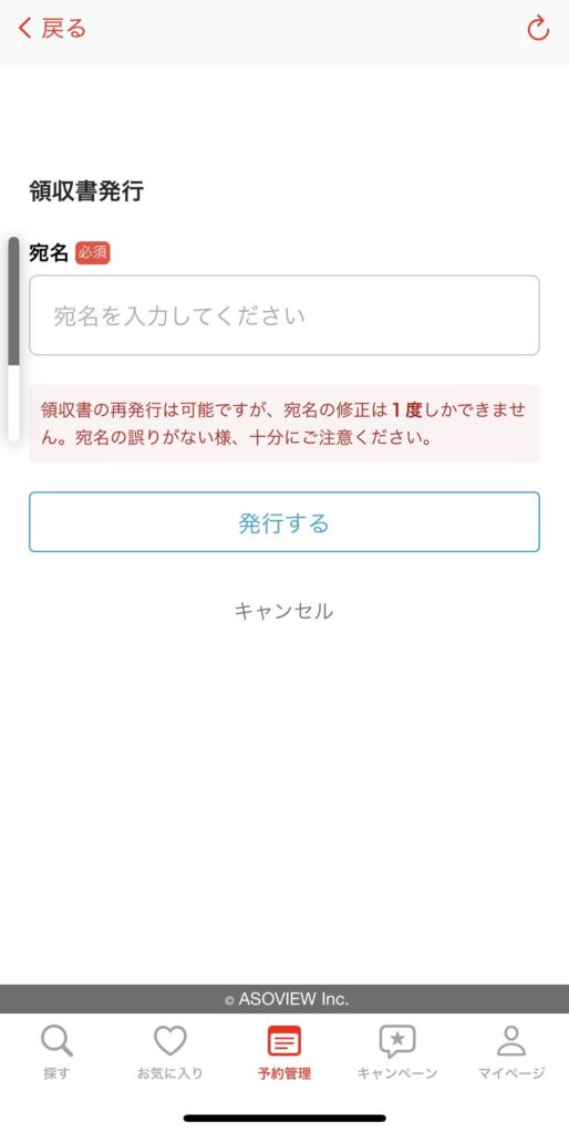 予約内容を確認したら、「領収書を発行する」ボタンをクリックして領収書を発行します。ここで宛名(名前)を入力する必要があります。