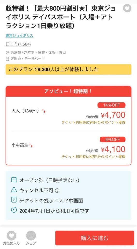 ![]() ![]() | 岡山 群馬 愛知 兵庫 | 入場料のみ 1,000円 (エリアにより異なる) | 利用日の当日 23:59まで無料キャンセル可 |