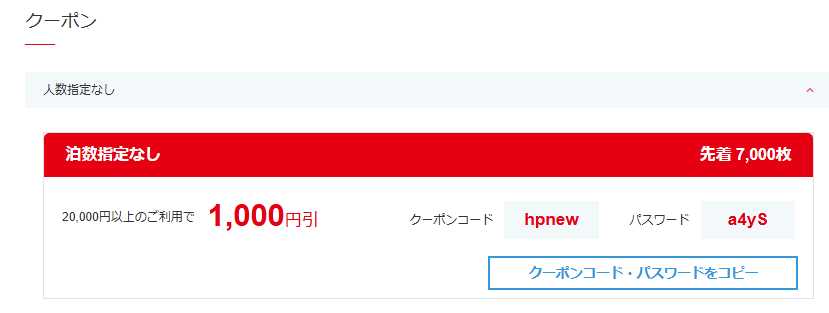 | クーポン① | 8,000円 | 2名・下限代金なし | 1500名 |