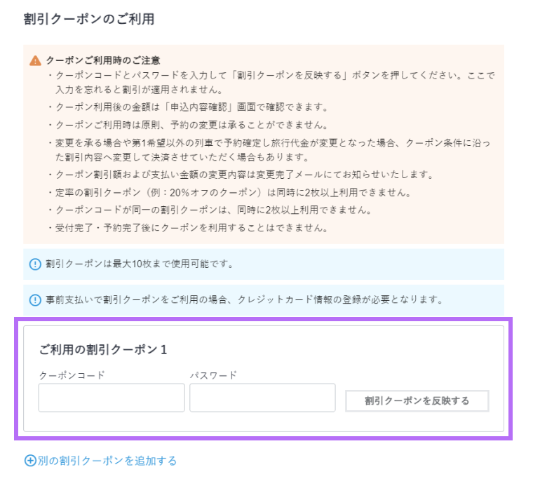 予約したい宿泊施設やプランを選択し、支払情報入力画面で、クーポンコードとパスワードを入力し、「割引クーポンを反映する」をクリックします。