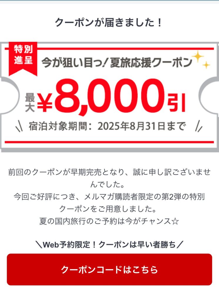 情報の通知はあっても、実際のクーポンコードはJTB公式サイトのキャンペーンページなどから自分で取得する必要があります。