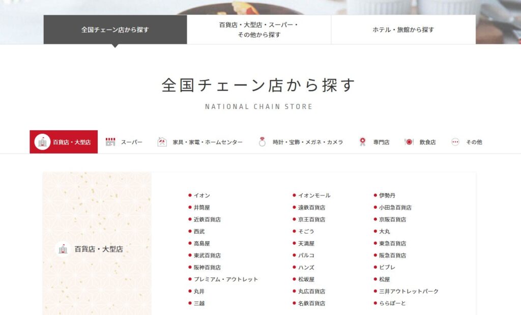 JTBの公式サイトでは、JTBナイスギフトが利用可能な店舗を簡単に検索できます。
