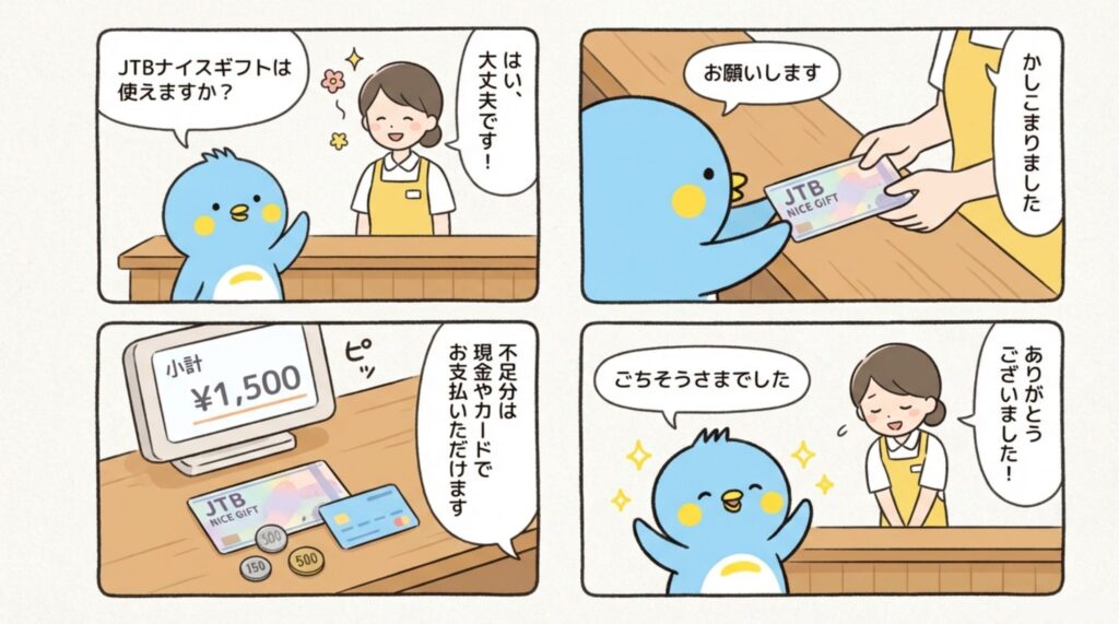 JTBナイスギフトは現金のように利用できますが、お釣りは出ません。