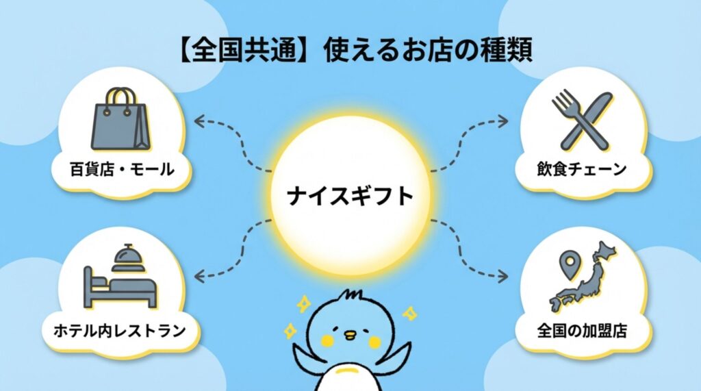 - ナイスギフト:飲食店や百貨店など、JCBギフトカード加盟店で利用可能