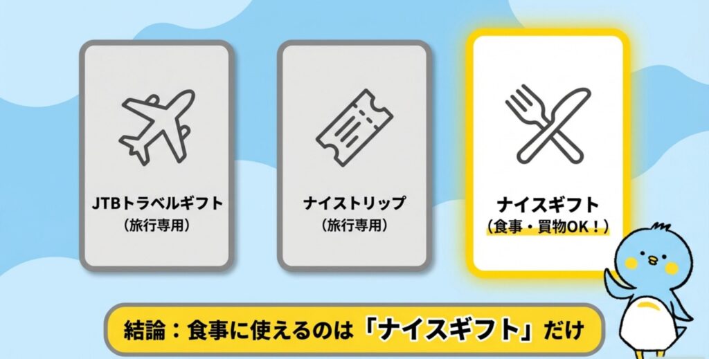 一方で「ナイストリップ」や「JTBトラベルギフト(カード型)」は旅行専用で、食事だけには使えません。