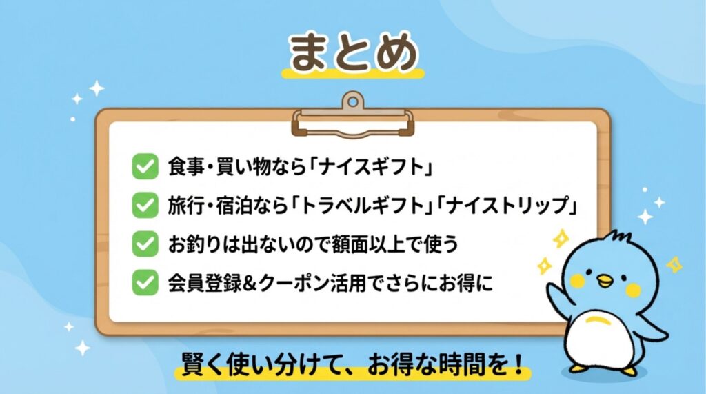 本記事では、ナイスギフトで食事できるお店や、3種類の旅行券の違いをわかりやすく解説。