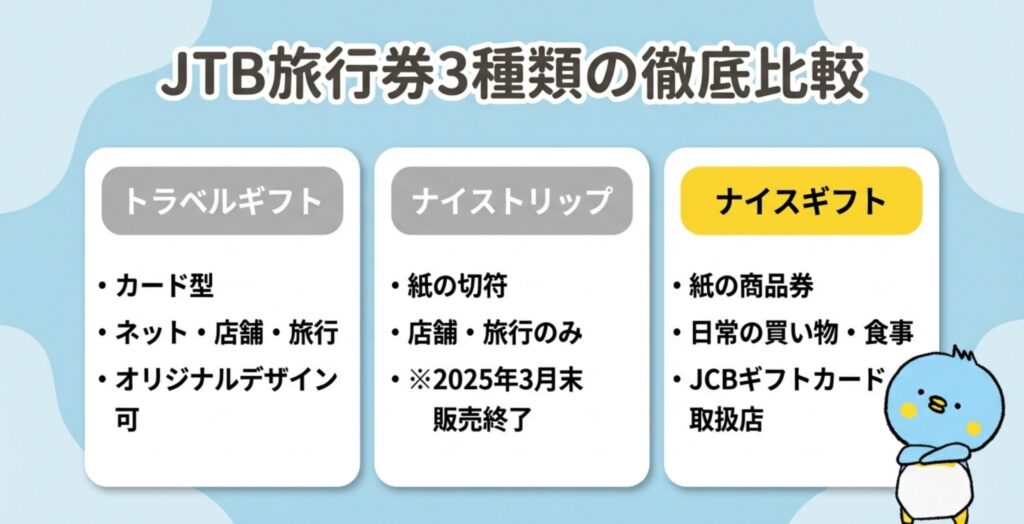 JTBの旅行券は3種類あり、用途や使える場所が異なります。