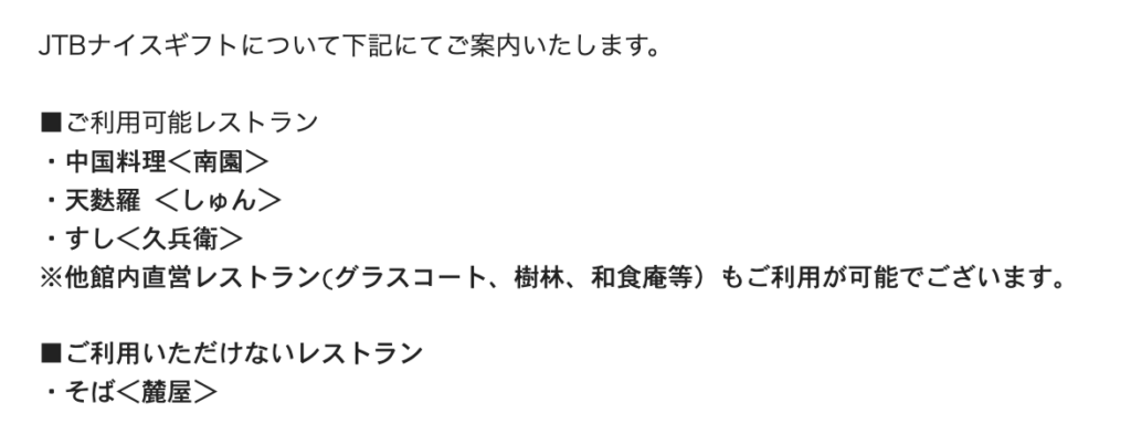 JTBナイスギフトを食事で使うときの注意点