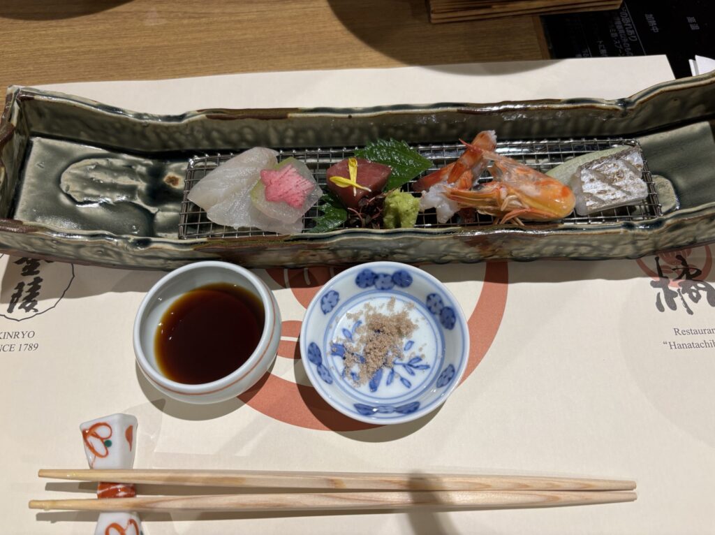 鱸(すずき)の洗い 本鮪 才巻海老 太刀魚炙り/あしらい 土佐醤油 藻塩