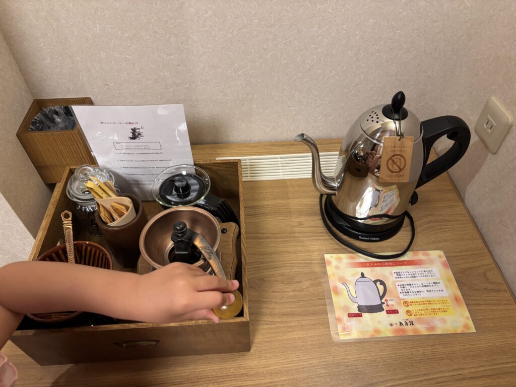 さらに、豆から淹れられるコーヒーセットが置いてあり、コーヒー用・お茶用に素敵なカップが2種類用意されているなど、細かい心配りが随所に光っていました。