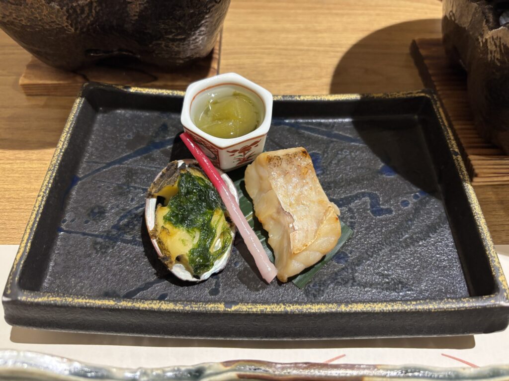 甘鯛味噌幽庵焼き 鮑あおさ焼き 青梅蜜煮 はじかみ
