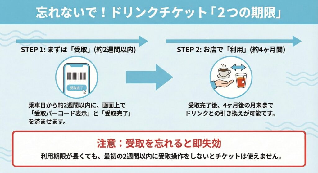 期限を過ぎると利用できなくなるため、早めの利用をおすすめします。 - ドリンクチケットはいつから利用できる?