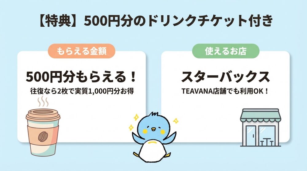 さらにドリンク引換券が付いているため、移動中のちょっとした飲み物代を抑えられるのも嬉しいポイントです。