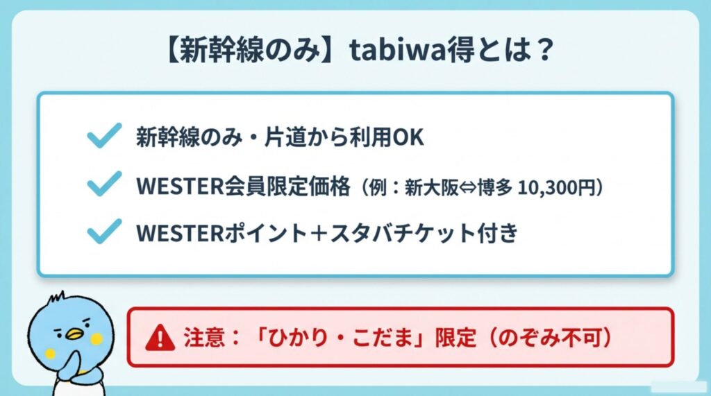 tabiwa得は、新幹線のみをお得に利用できるWESTER会員限定プランです。