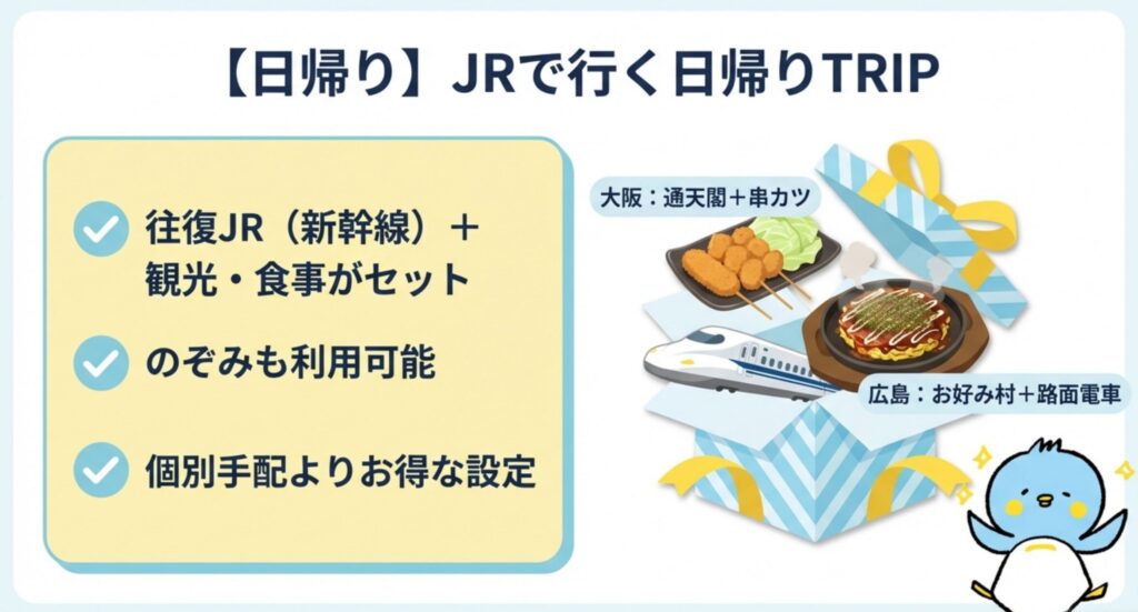 tabiwa得とは異なり、観光向けの特典がセットになった日帰りプランです。