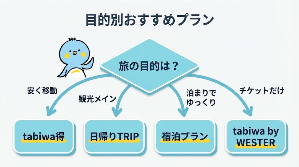 特に「tabiwa得」「日帰りTRIP」「宿泊プラン」は仕組みが異なるため、事前に違いを把握しておくと安心です。