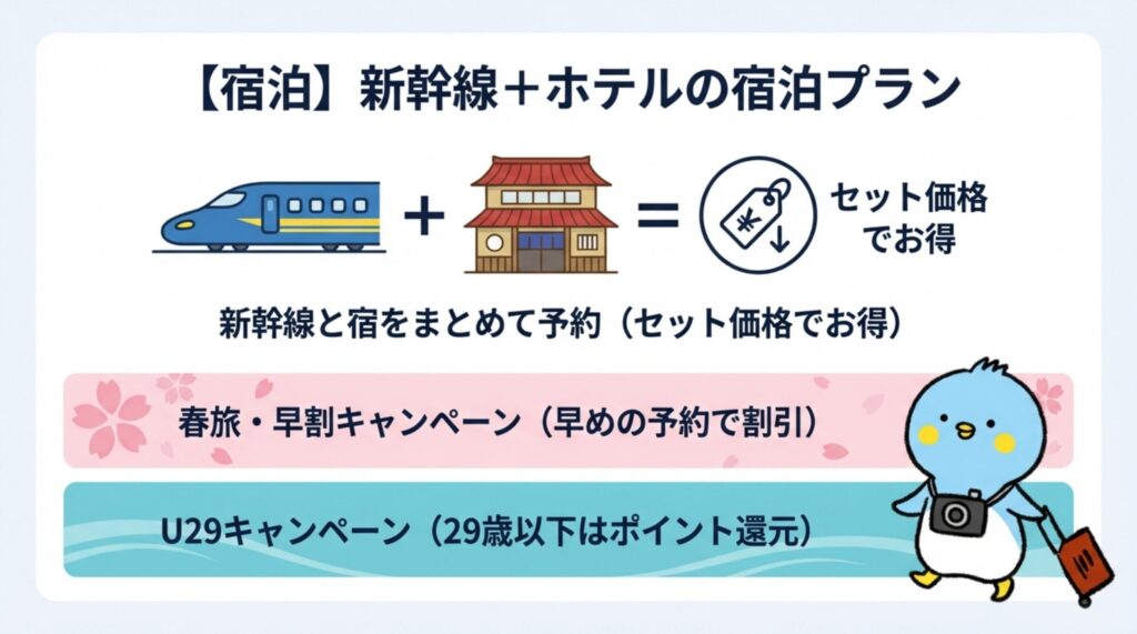 宿泊プランは、新幹線(JR)往復とホテル宿泊がセットになったパッケージ商品です。
