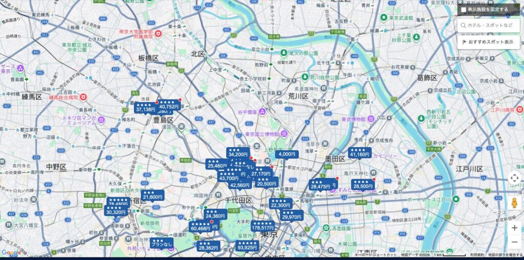 2026年3月現在、ホテルの宿泊予約を地図表示で見てみると2万円以上のホテルがずらり…
