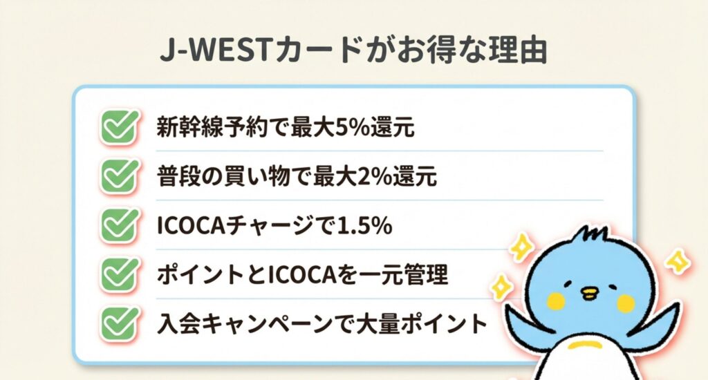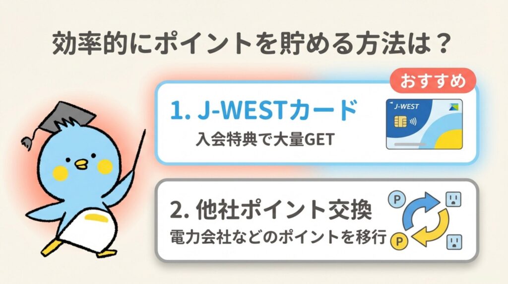 日常利用だけで貯めるのは時間がかかるため、J-WESTカードを使って効率的に貯める方法がおすすめです。