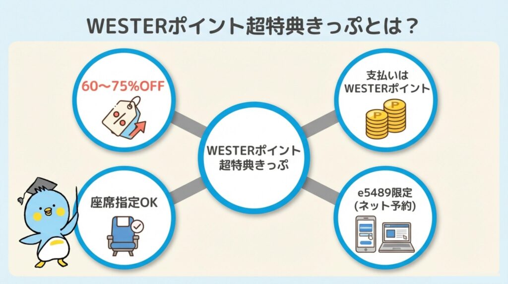 「WESTERポイント超特典きっぷ」とは、貯めたWESTERポイントを使って、新幹線の指定席を大幅割引で利用できる特典きっぷです。